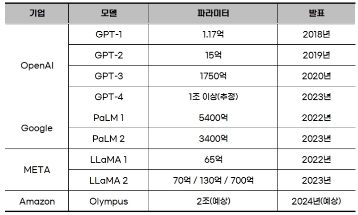 2번째 키워드로 설명한 ChatGPT를 시작으로 생성형AI가 화두가 되자 전세계의 빅테크 기업에서는 이에 뒤처지지 않도록 자체 개발한 LLM을 발표하게 됩니다. 이 때 주목받았던 용어 중 하나가 바로 매개변수(파라미터) 인데요.