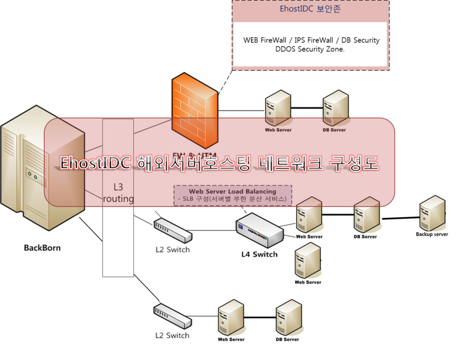 아래의 네트워크 구성도는 해외에 구축되어 있는 이호스트IDC 해외 서버호스팅 서비스 구성도입니다.