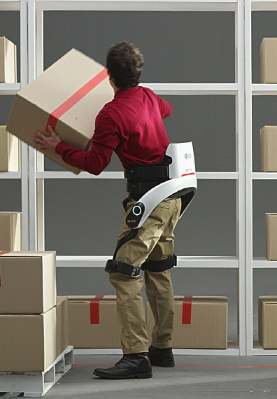 사용자의 허리근력을 보조하는 LG 클로이 수트봇. 반복되는 작업에서 사용자의 허리에 가해지는 부담을 줄여줄 수 있다.