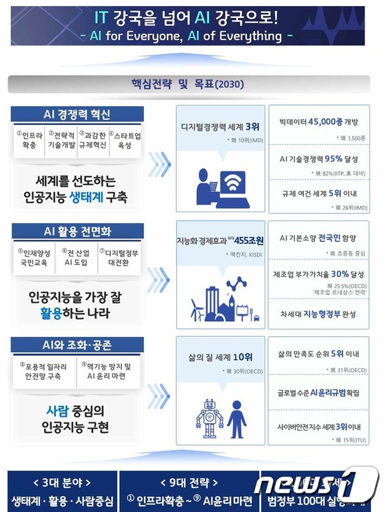 'IT 강국을 넘어 AI 강국으로'라는 슬로건이 붙은 이번 전략의 목표는 2030년까지 △디지털 경쟁력 세계 3위 달성 △AI를 통한 지능화 경제효과 최대 455조원 창출 △삶의 질 세계 10위 등 세 가지다. 이를 위해 △AI 생태계 △AI 활용률 △인간 중심 AI 등 3대 분야, 9대 전략과 100대 실행과제를 실천한다.