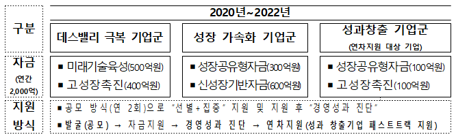 기술사업성 평가 우수기업, 매출 및 영업이익 증가 기업, 민간투자 유치기업을 선정심의위원회 IR(Investor Relation) 방식으로 선별하며, 지원 후 성과창출 기업은 연차적으로 소요자금을 융자 지원할 예정이다. 2020~2022년 동안 연간 100개사, 2,000억 원을 지원한다.