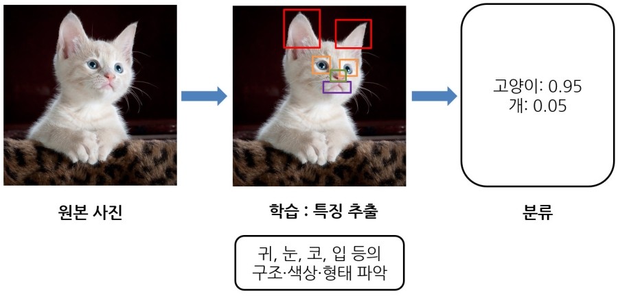 예를 들어, 고양이 사진을 AI에게 학습시킨다고 가정해보자. 기존 머신러닝에서는 고양이 사진이 갖는 특징을 인간이 먼저 분석하고 분류해 컴퓨터가 인식할 수 있도록 설계해주어야 했다. 하지만 딥러닝에서는 인간이 그러한 작업을 할 필요 없이 컴퓨터에게 수많은 고양이 사진을 제공하면 컴퓨터가 스스로 특징을 찾아낸다.
