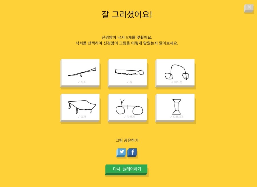 정리하면, 딥러닝은 컴퓨터 스스로 데이터를 통해 특징을 추출하고 이를 기반으로 학습을 함으로써 AI 성능을 개선한다. 딥러닝의 성능을 이해할 수 있는 서비스를 하나 살펴보자. 구글이 선보인 ‘퀵 드로우(Quick, Draw!)’는 사용자가 제시된 단어에 맞는 그림을 그리면 딥러닝 기반의 AI가 답을 맞히는 온라인 게임이다. 구글은 이를 위해 AI에게 5천만 개에 달하는 방대한 그림을 학습시켰다.