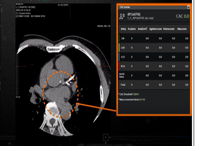 환자의 영상을 AI가 판독해 관상동맥 석회화 병변 위치(오른쪽 동그라미)를 찾아내고, 석회화 점수(왼쪽 네모)를 자동 산출하는 기능