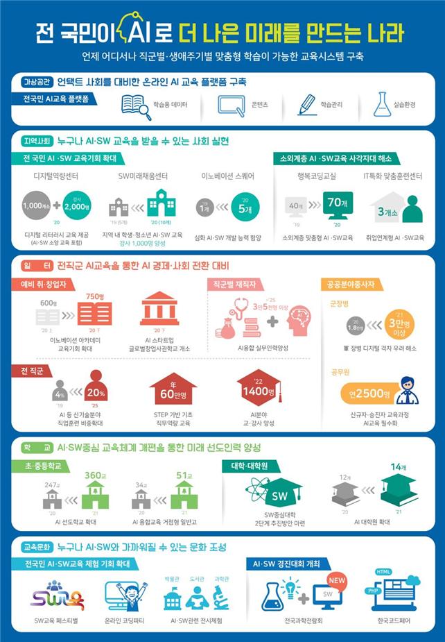 체계적인 초·중등학교 인공지능·소프트웨어 교육을 위해 인공지능 교육 내용·범위기준을 마련하고 교육과정 개정 시 정보 수업시간을 확대하는 한편, 2021년부터 인공지능 교육 선도학교를 본격 운영하여 우수 인공지능 교육사례 발굴·확산을 추진한다.