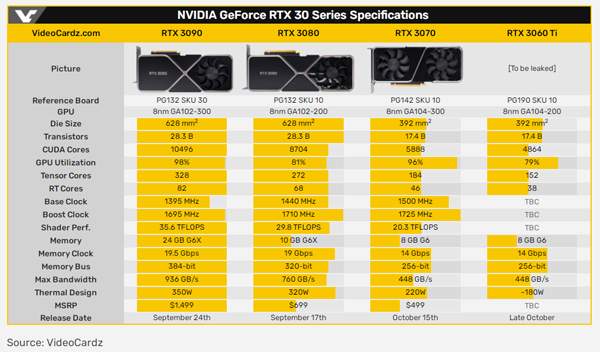 videocardz에 따르면 두 곳의 소스를 통해 이같은 사실을 확인했다고 전했다. 현재 알려진 내용에 따르면 RTX 3060 Ti는 4864CUDA 코어와 GDDR6 메모리 8GB 메모리가 탑재되며, 구체적인 출시 일정은 알려지지 않았지만 10월 말 출시될 것으로 기대된다.