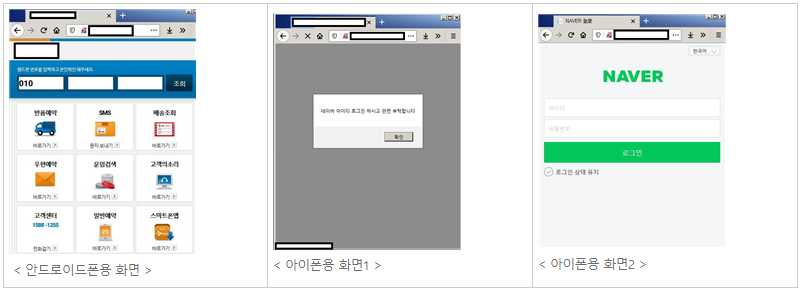 - (안드로이드폰 + 아이폰(네이버 계정 탈취)) 스미싱 문자에 포함된 URL에 접속하면 안드로이드 폰은 악성앱 유포․설치를 유도하고, 아이폰은 네이버 로그인을 사칭하는 페이지로 접속하여 계정을 탈취
