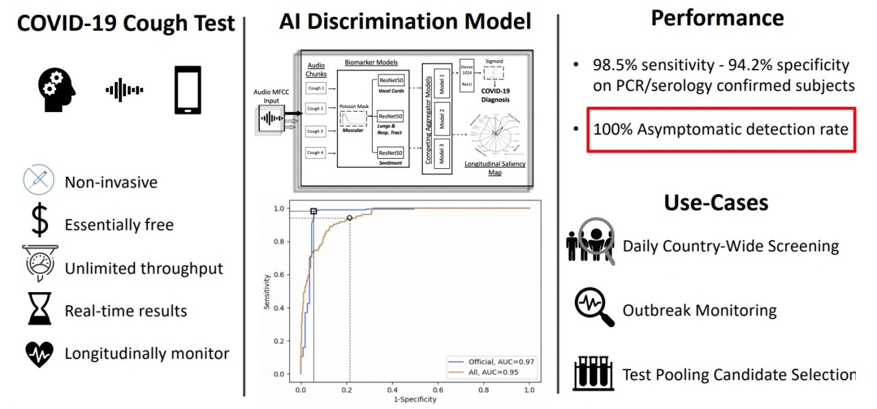 MIT Auto-ID 연구팀이 무증상인 사람들이 기침하는 방식이 건강한 개인과 다를 수 있음을 발견했다. 이러한 차이는 인간의 귀로 해독할 수 없다. 그러나 그들은 인공지능(AI)에 의해 포착될 수 있다는 것이 밝혀졌다. 이 인공지능 모델은 웹 브라우저와 휴대폰 및 노트북과 같은 장치에서 기침소리 녹음을 통해 무증상인과 건강한 사람을 구별한다.