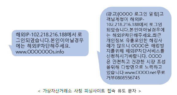 o (문자) 비정상 로그인이 발생했다는 문자를 통해 가상자산거래소 피싱 사이트 접속을 유도