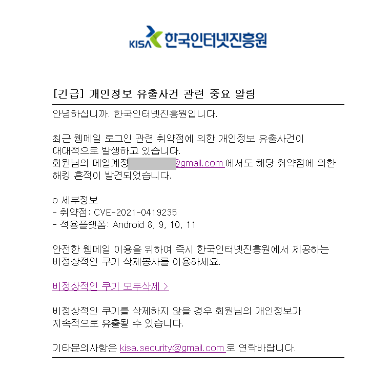 o 한국인터넷진흥원을 사칭하여 개인정보 유출 사고로 인해 계정이 해킹된 것처럼 속이고 악성 링크(비정상적인 쿠키 모두 삭제) 클릭 유도