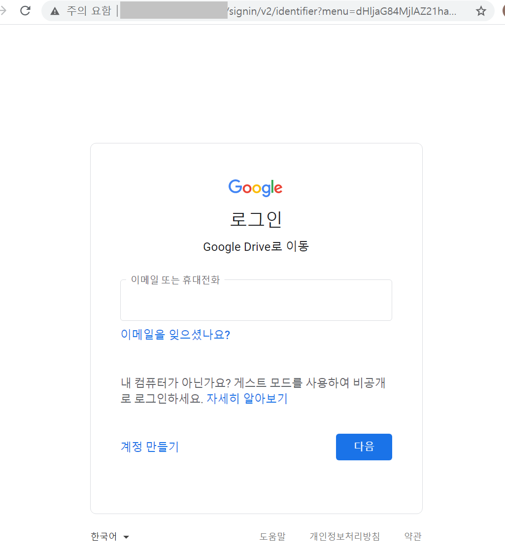 o 이메일 내부 악성 링크(비정상적인 쿠키 모두 삭제) 클릭 시 정상 인터넷 서비스(google drive 등)를 가장한 피싱 사이트로 연결되어 아이디 및 비밀번호 입력을 요구하므로 주의 필요