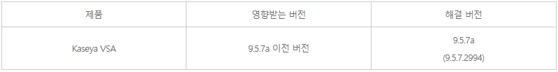 o Kaseya社는 자사 VSA 제품에서 발생하는 취약점을 해결한 보안 업데이트 발표