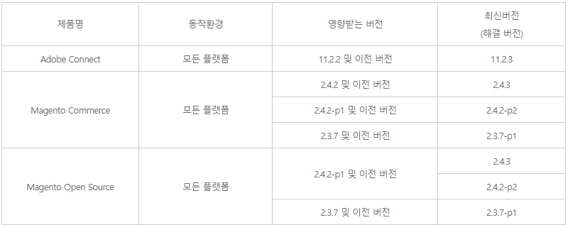 ※ 아래의 Adobe 참고사이트에서 “Solution”의 “Availability” 항목 참고하여 업데이트 수행