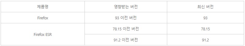 o Firefox ESR에서 메모리 충돌로 인해 발생하는 임의코드실행 취약점(CVE-2021-38500) 등 6개 [3]