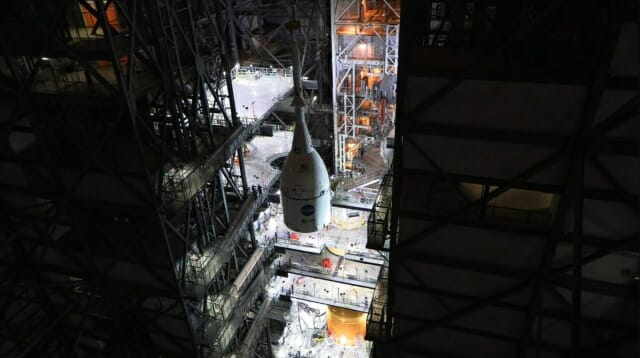 NASA 케네디 우주 센터는 해당 영상을 공개하며, 트위터에 "우주선을 로켓에 완전히 고정시키기 위한 작업이 현재 진행 중"이라고 밝혔다. SLS와 오리온 우주선의 높이는 약 98m로, 자유의 여신상보다 더 높다고 NASA 측은 설명했다.