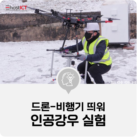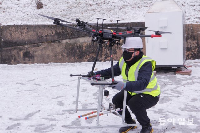 7일 오후 눈이 흩날리는 강원 평창군 대관령면 구름물리선도관측소에서 막대 폭죽 같은 모양의 요오드화은(AgI) 연소탄을 장착한 드론이 굉음을 내며 하늘로 오르기 시작했다. 드론이 150m 상공까지 올라 흐린 하늘 속에 점만큼 작게 보이자 딱 하고 무언가 터지는 소리와 함께 회색 연기가 뭉게뭉게 피어올랐다.