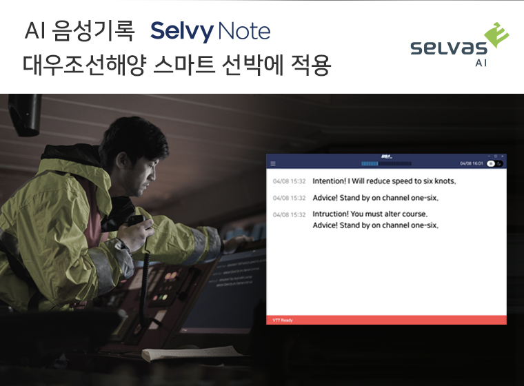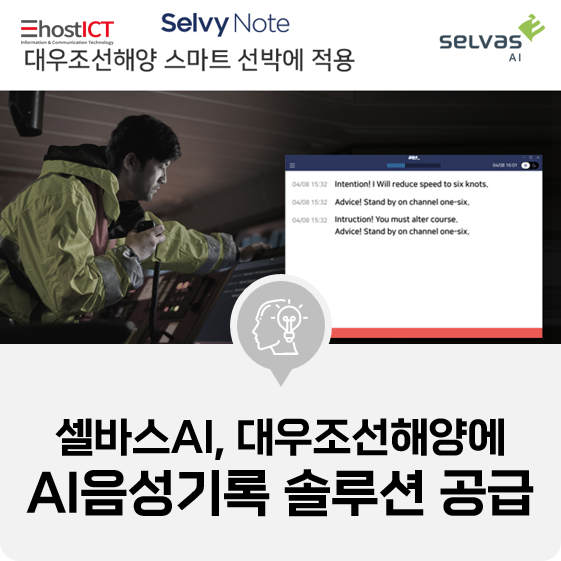셀바스AI의 셀비 노트는 여러 사람의 음성을 텍스트로 자동 전환하는 AI 기반 솔루션이다. 대우조선해양은 해당 기능을 스마트 선박에 탑재해 해상용 무선 송수신기에서 출력한 음성 교신을 텍스트로 자동 전환해 선박 내 모니터에 시각화하는 용도로 사용할 전망이다.