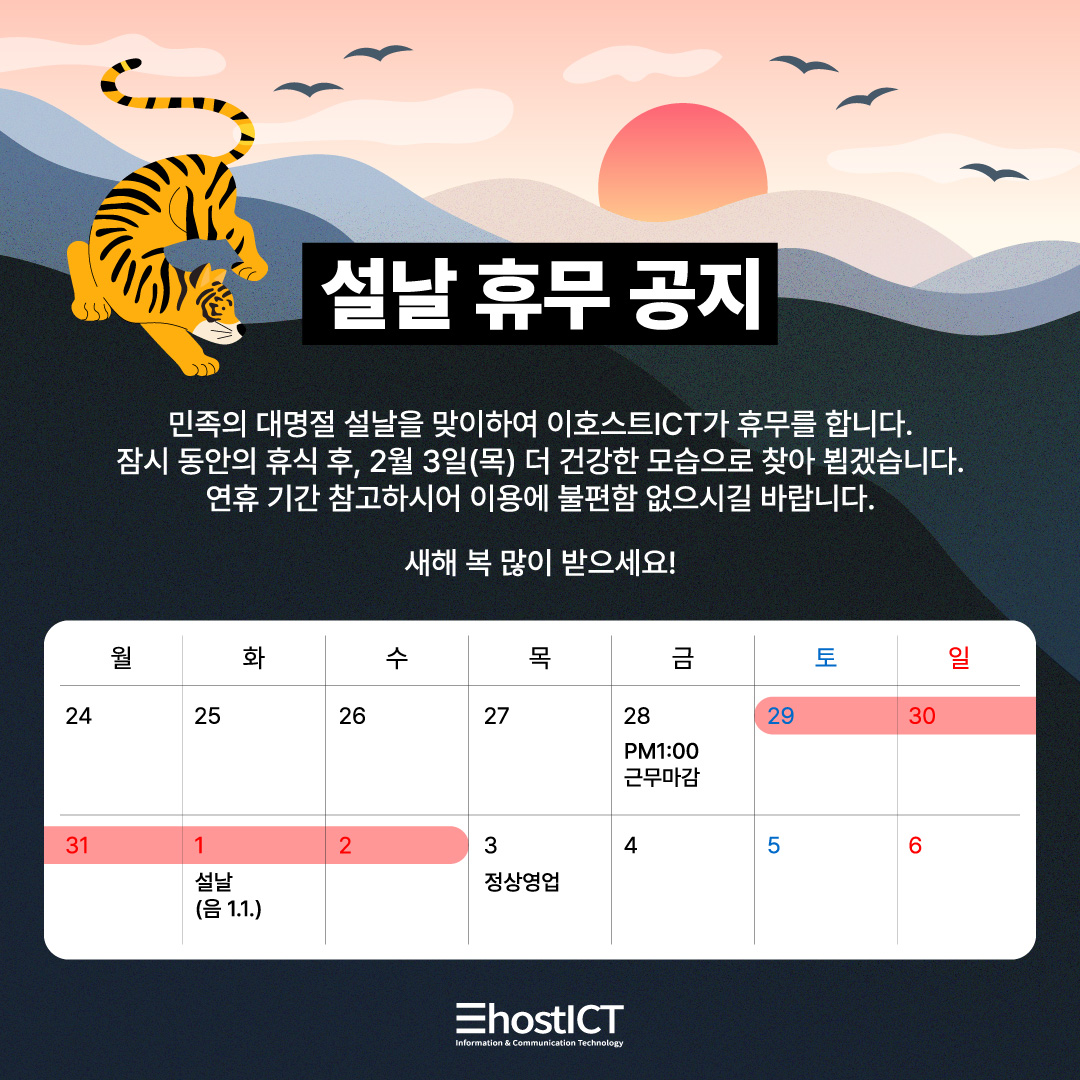 민족의 대명절 설날을 맞이하여 이호스트ICT가 휴무를 합니다.
