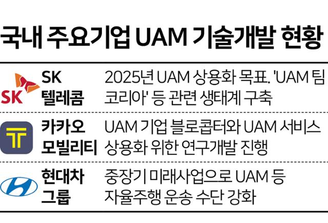 꽉 막힌 출퇴근 길, 뻥 뚫린 하늘을 나는 '에어택시'는 현실화될 수 있을까. 4차 산업혁명 시대 대표적 미래기술로 손꼽힌 도심항공교통(UAM) 기술 경쟁이 치열하다. 글로벌 정보기술(IT)기업과 비행체 제조사들이 UAM 산업 투자에 나선 가운데 국내 IT업계도 UAM 협업 시스템 확대로 글로벌 경쟁에 합류했다.