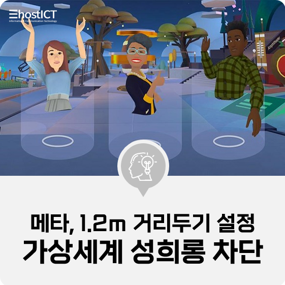 메타는 `호라이즌 월드`와 `호라이즌 베뉴` 앱을 통해 이용자들에게 가상세계 서비스를 제공하고 있는데, 이 두 가지 서비스를 이용하는 고객의 아바타 주위에 `개인 경계선'이라는 공간을 부여하고 아바타끼리 4피트, 1.2m 거리를 유지하도록 했습니다.