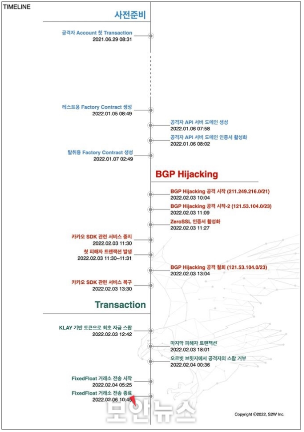 이번 클레이스왑 공격에서의 주요 타임라인은 다음과 같다. 2월 3일 10시 4분 BGP Hijacking 시도가 최초 확인됐고, 11시 9분에 BGP Hijacking 시도가 추가 확인됐으며, 11시 30분에 카카오 SDK 관련 서비스가 중지된 것으로 분석됐다. 그때부터 1분 정도 이상 트랜젝션이 최초 발생했으며, 오후 1시 4분에 BGP Hijacking 공격이 철회된 것으로 추정된다. 오후 1시 28분에 공격 철회로 인해 정상 라우팅 경로로 갱신됐고, 오후 1시 30분에 카카오 SDK 관련 서비스가 복구됐다. 그러나 또 다른 오염 대역에서는 원래 라우팅 경로로의 갱신이 최소 오후 5시까지 이루어지지 않았으며, 그로 인해 피해가 지속되면서 오후 6시 1분까지 이상 트랜잭션이 발생된 것으로 추정된다.
