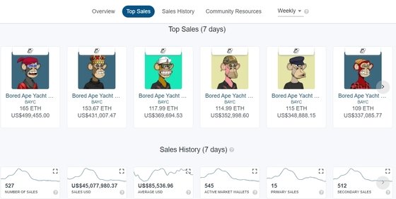 BAYC의 지난 7일 거래양은 모두 517건. 주간거래액은 4502만 9725달러(536억 5291만원)에 달한다. BAYC 평균 거래 가격이 '1억원'이라는 이야기다.