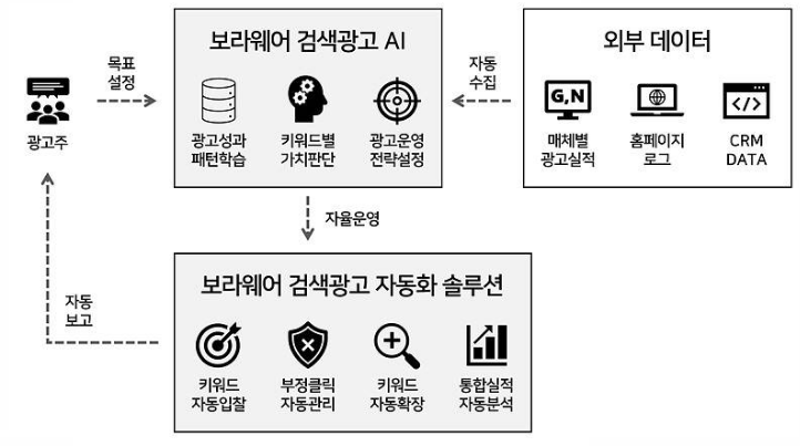 검색 광고 자동화 솔루션 스타트업 보라웨어는 인공지능으로 광고 성과를 내는 성과기반 AI 운영 서비스를 올 1월 공개했다. 인공지능이 검색 광고 전반을 관리하고, 과거의 데이터를 분석해 스스로 성과를 내는 서비스다.