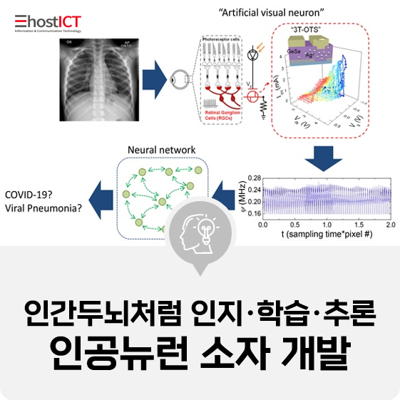연구진은 3단자 OTS 소자를 광전 변환 센서와 연결해 인체 감각기관의 정보처리 방식을 흉내 내는 인공시각 뉴런소자를 구현하는데도 성공했다. 또 인공 시각 뉴런 소자를 두뇌의 시각 중추를 모사한 인공 신경망과 연결해 폐의 X-ray 이미지 학습을 통해 86.5%의 정확도로 코로나19와 바이러스성 폐렴을 구별할 수 있음을 보였다.