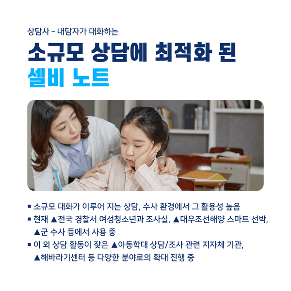 'AI 음성기록 솔루션'은 음성인식 기술을 활용하여 회의, 상담 내용은 물론, 녹음 파일도 문서로 변환해주는 제품이다. 최근 들어 빠르게 확산되며 상담, 조사 업무로 인해 기록 작성에 많은 시간을 쏟는 상담사, 경찰관들이 이용한다. 내담자, 피해자와 나눈 말을 AI 음성기록 솔루션으로 빠짐없이 텍스트화 할 수 있어 다시 문서를 정리하는 번거로움이 상당 부분 해소되기 때문이다.