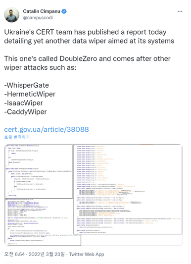 /김혜경 기자(hkmind9000@inews24.com)지난 23일 우크라이나 CERT는 '더블제로'라는 멀웨어가 자국 내 주요 기관을 겨냥했다며 관련 보고서를 발표했다. [사진=트위터 화면 캡쳐 ]