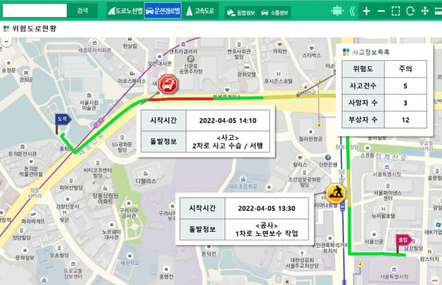 △교통사고정보 △기상정보(기상청) △돌발상황정보(경찰청) 등 빅데이터를 분석해 도로의 위험도를 안전-위험-주의-심각 4등급으로 표출하고, 실시간 기상정보, 돌발정보(집회, 사고, 공사 등)와 운전경로상의 도로 위험도를 확인할 수 있다.