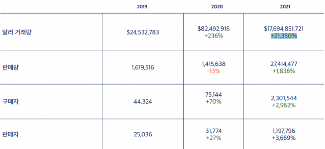 NFT 분석 업체 논펀지블닷컴에 따르면 지난해 NFT 달러 거래액은 약 176억9천만 달러(약 21조8천억원)로 전년 대비 2만1천% 넘게 성장한 것으로 나타났다.