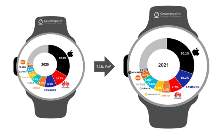 브랜드별 출하량 점유율을 보면 압도적인 1위는 애플이다. 애플의 점유율은 30.1%로, 전년(32.9%)보다 소폭 줄었지만 여전히 스마트워치 시장 맹주로 자리잡고 있다. 삼성(10.2%), 화웨이(7.7%), 아이무(5.2%), 어메이즈핏(5.1%), 가민(4.6%), 핏빗(3.8%), 샤오미(3.6%), 노이즈(2.6%) 등이 뒤를 이었다. 이들 외 기타 브랜드의 점유율도 약 28%에 달한다.