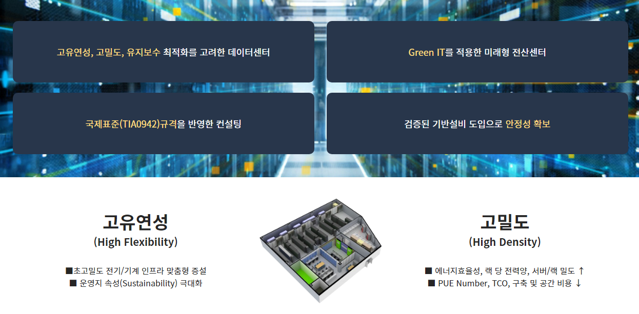 그리고 친환경적인 미래형 전산센터 구축에도 앞장서고 있다. 국제표준(TIA-942) 규격을 반영함은 물론, Green IT를 적용하여 저탄소를 충족하고, 최신 기술을 적용해 시스템 지능화에도 힘쓰고 있다.