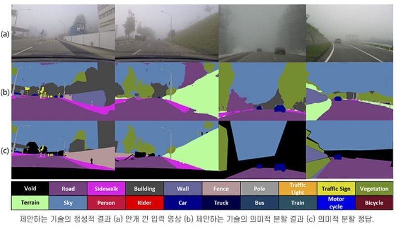 포항공과대학은 인공지능대학원·컴퓨터공학과 곽수하 교수·인공지능대학원 통합과정 이소현 씨·컴퓨터공학과 손태영 석사 연구팀은 짙은 안개가 낀 날씨에서도 사람, 자동차, 도로, 나무 등 의미에 따라 영상을 정확하게 분할하는 영상인식 인공지능(AI) 기술을 개발했다고 밝혔다.