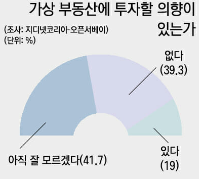 가상 부동산 투자 의향에 대한 질문에선, 응답자 41.7%가 ‘아직 잘 모르겠다’고 답했다. 투자 의향이 없다는 응답이 39.3%, 있다고 답한 비율이19%로 집계됐다.