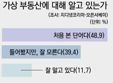 가상 부동산을 알고 있는지 묻는 질문에, 응답자 절반 가까운 48.9%가 ‘처음 본 단어’라고 응답했다. 또 ‘단어는 들어봤지만, 잘 모른다’가 39.4%, ‘가상 부동산 개념과 관련 플랫폼을 잘 알고 있다’가 11.7%로 집계됐다.