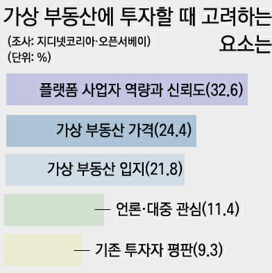 응답자 32.6%는 가상 부동산을 선택할 때 '플랫폼 사업자 역량과 신뢰도'를 최우선으로 고려했다. 가상 부동산 가격, 입지는 각각 24.4%(47명), 21.8%(42명)였다.