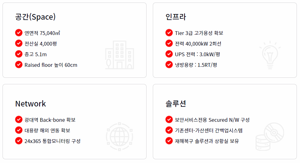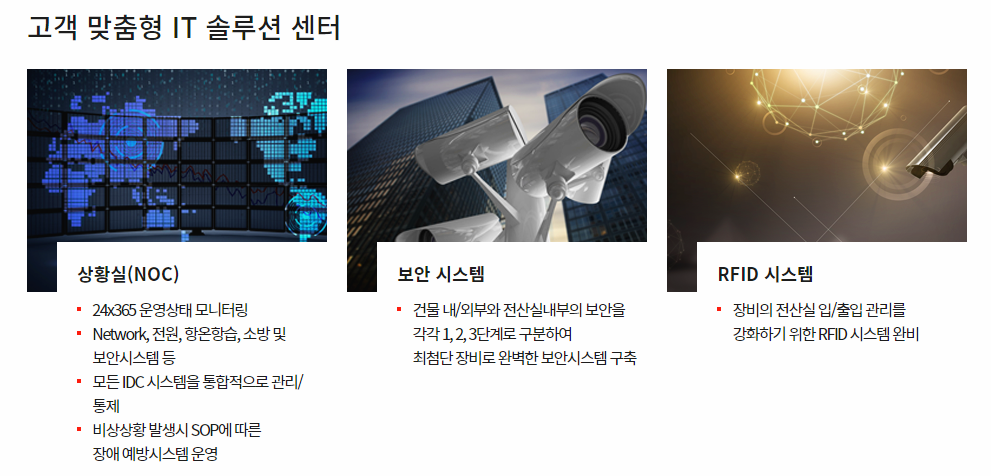 또한 고객 맞춤형 IT 솔루션 센터를 갖추고 있기 때문에 고객 요구사항에 유연하게 대응이 가능한데요. 365일 24시간 모니터링을 통해 운영상태를 실시간으로 모니터링하여 혹시 모르는 사고나 장애에 항시 대비하고 있습니다. 건물 내·외부와 전산실 내부에는 최첨단 장비를 설치하여 완벽한 보안 시스템을 구축하고, 이 외에도 데이터를 안전하게 보관하기 위해 보안에 특화된 여러가지 솔루션을 제공하고 있습니다.