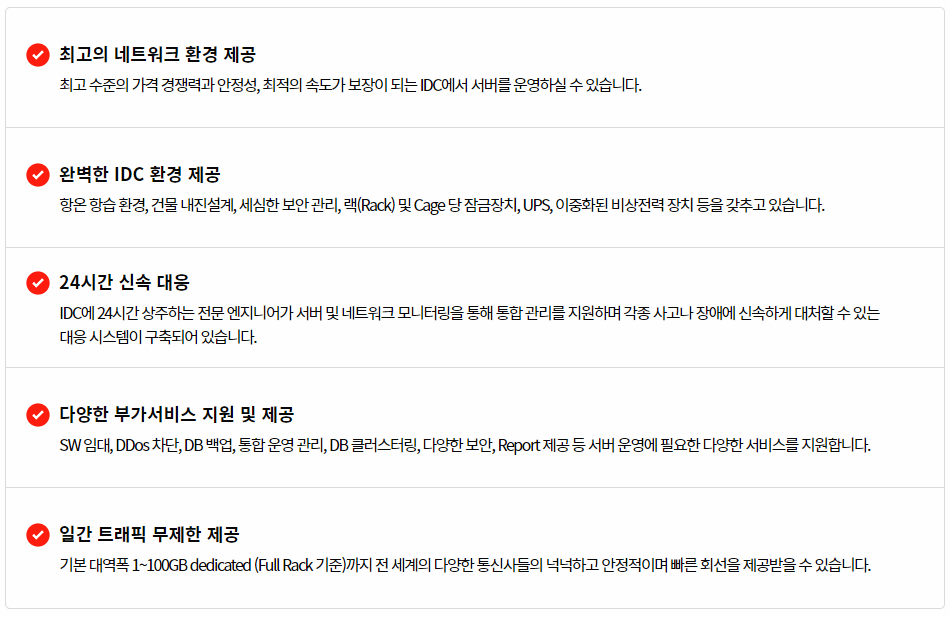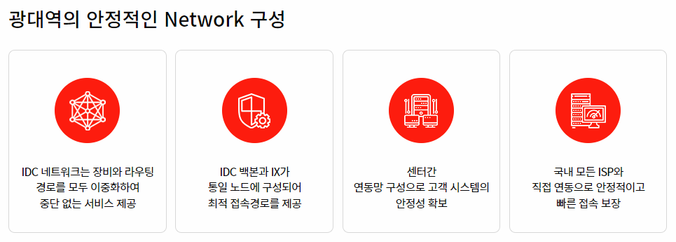 첫 번째, 최고의 네트워크 환경을 제공하기 때문에 가격, 안정성, 최적의 속도가 보장이 되는 IDC에서 서버를 운영할 수 있습니다.