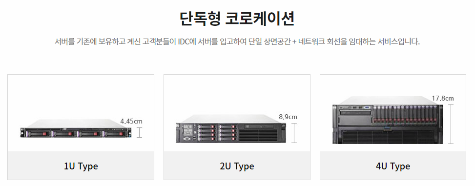 이호스트ICT의 코로케이션은 단독형 코로케이션과 상면형 코로케이션으로 구분 지을 수 있는데요. 단독형 코로케이션은 단일 상면 공간과 네트워크 회선을 임대해주는 서비스로 1U, 2U, 4U 타입 중 원하는 사양에 맞춰 선택할 수 있습니다.
