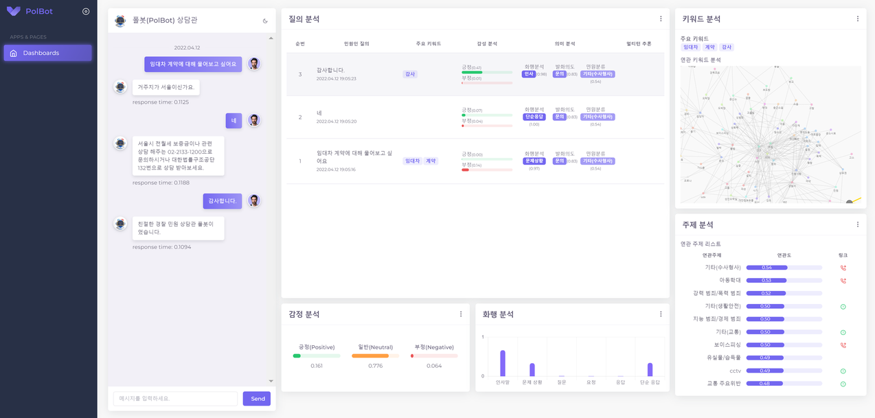 AI 관련 R&D의 현장 적용 가능성을 높이기 위해서는 시스템 기술 고도화와 함께 부가적인 기능들에 대한 개발도 필요해 보인다. 인입콜 수, 폴봇 자동 응대 건수, 상담관 연결 건수 등 폴봇-상담관 협업에 대한 통계는 AI 서비스 확대에 있어서 기술 수준으로만 평가될 수 없는 사용자들의 서비스 만족도나 AI 서비스 도입에 따른 사용자들의 민원콜 패턴 변화 등을 파악하는데 사용될 수 있으며, 서비스 구현과 관련된 대화 시나리오 설계와 대화 응답 생성 알고리즘 개발 등에도 도움이 된다.
