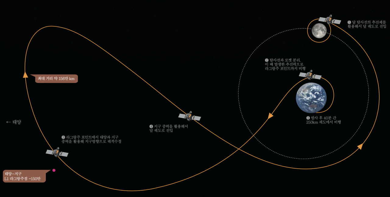 달 전이 궤적에 진입한 다누리는 태양전지판, 안테나 전개 등 정상 운영을 위한 작동 및 점검을 수행하고, 약 4.5개월 동안 총 9회의 궤적 수정 기동을 동을 수행해 계획한 궤적을 따라 달에 접근, 12월 16일 달 궤도에 도착한다.