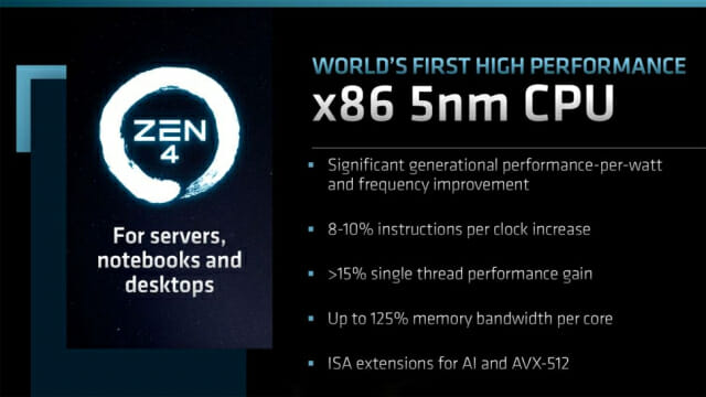 AMD는 올 하반기 데스크톱용 라이젠 7000 프로세서와 4세대 에픽 프로세서에 젠4 아키텍처를 적용할 예정이다. AMD에 따르면 이들 프로세서는 전세대 제품인 젠3 대비 1코어 성능이 15% 이상, 전체 성능은 35% 이상 향상될 전망이다.