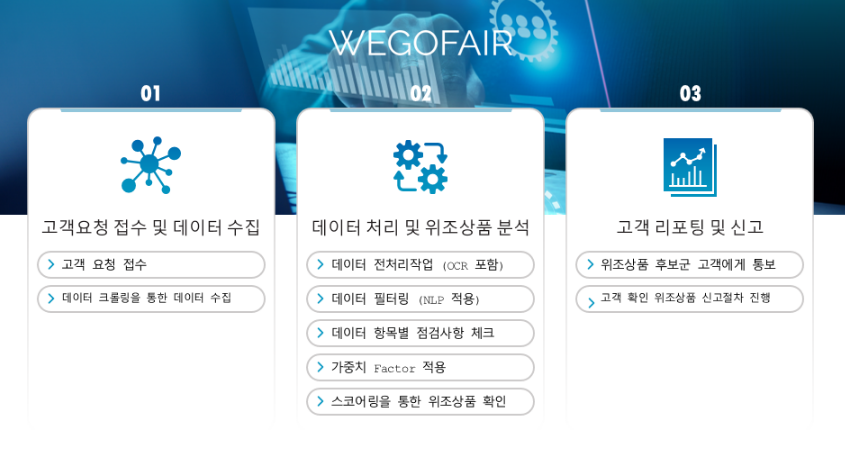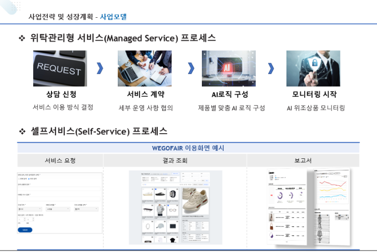 위고페어는 AI 기반의 온라인 위조상품 모니터링과 문제 해결을 위한 B2B 플랫폼이다. 플랫폼의 핵심은 정당한 대가를 지불하지 않고 타인의 창작 또는 브랜드 가치에 편승하는 위조상품의 온라인 유통을 AI 알고리즘을 통해 모니터링하고 탐색하는 것이다. 위조물이 탐지되면 이를 정당한 권한을 가지고 있는 권리자에게 전달하고 대응 조치가 이루어질 수 있도록 돕는 방식이다.