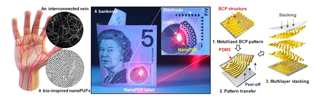 연구팀은 분자조립 나노 패턴 기술을 이용해 서로 다른 모양을 가지는 수십억 개의 나노 패턴을 저비용으로 만들어 인증기술로 개발했다. 높은 보안 수준을 유지하면서도 초고속 인증이 가능하다.
