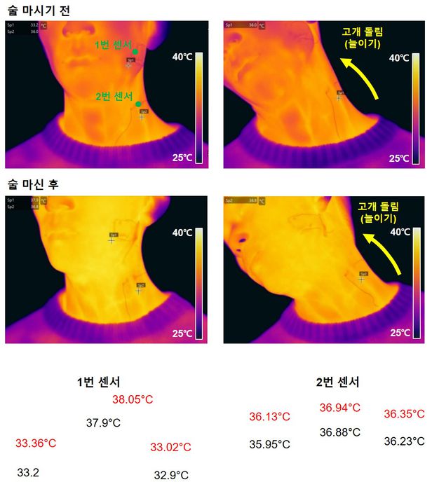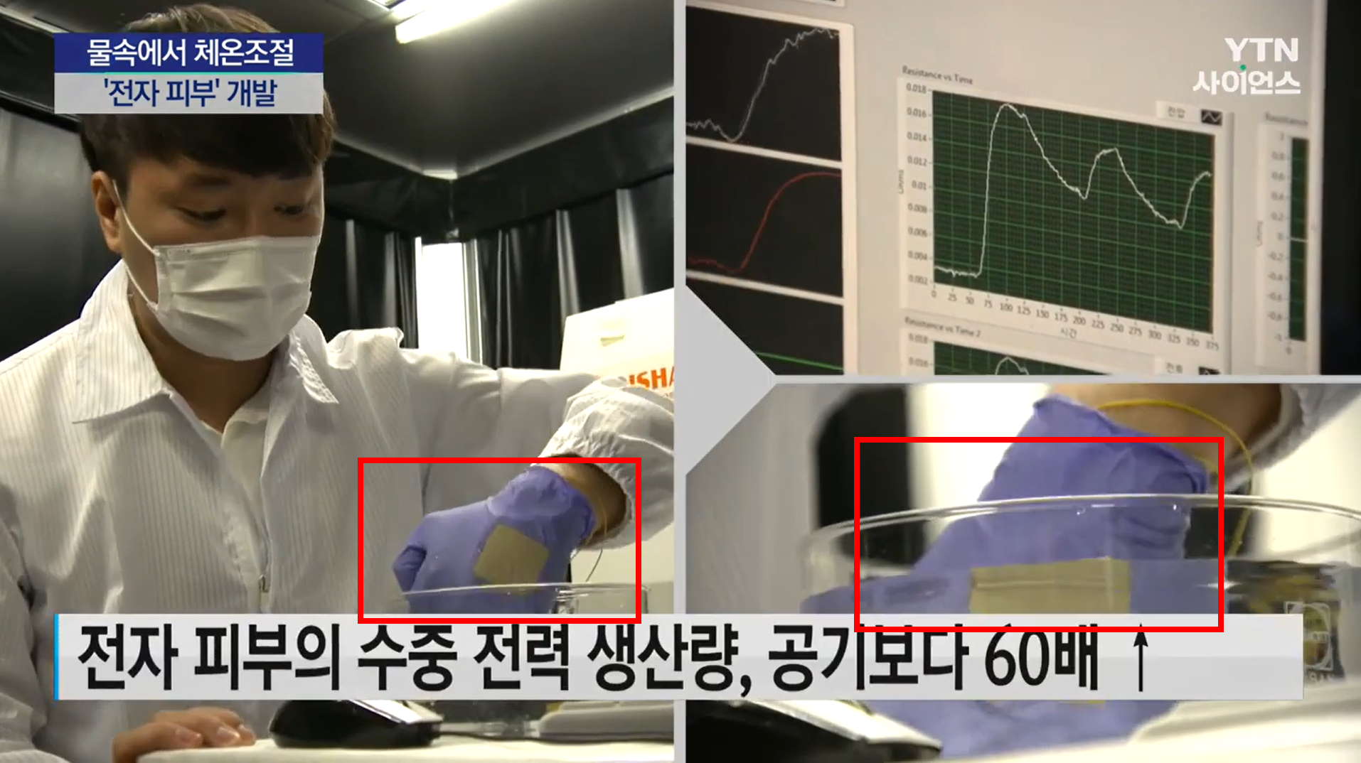 전자피부를 부착한 장갑을 물속에 넣으면 바로 전력 생산 그래프가 크게 올라가는 모습을 확인할 수 있는데요. 실제로 공기 중에서보다 물속에서 전력 생산량이 60배 이상 높아지는 것으로 나왔습니다. 이렇게 전자피부가 만들어낸 전력으로 심전도 등 각종 센서를 작동시킬 수도 있는데요. 이런 센서들을 통해 수중 작업자의 상태를 실시간으로 파악하고 작업자의 저체온이 확인되면 전자 피부에 전류를 흘려 펠티에 효과*를 이용해 냉온감을 구현함으로써 작업자의 체온을 일정하게 유지해 줄 수 있습니다.