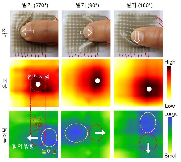 사람의 피부가 자극이나 온도 정보를 인식하고 전기 신호를 만들어 뇌에 전달하듯 이 전자피부 역시 그 기능을 해내는데요. 인간의 피부가 촉각 수용체 전해질로 가득 차 있기 때문에 변형이 자유로우면서도 망가지지 않는다는 점에서 착안해 개발했습니다. 또한 전해질을 함유한 이온 전도체 소재가 측정 주파수에 따라 측정할 수 있는 성질이 달라진다는 점을 활용해서 촉각과 온도를 동시에 측정할 수 있는 다기능성 인공 수용체를 만들어낸 것인데요. 이 전자피부는 밀림, 꼬집기, 벌림, 비틀림 등 여러 움직임에 대해 힘을 가한 방향이나 늘어난 정도는 물론이고 자극을 준 물체의 온도까지도 정확히 측정해낼 수 있습니다.