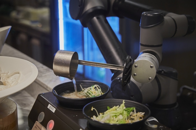 방문객이 원하는 재료를 그릇에 담아 로봇에 건네면 조리를 시작한다. 뜨거운 물에 국수 재료를 데치고 다시 그릇에 담고 육수를 부어 완성한다. 이렇게 국수 한 그릇이 나오기까지 걸리는 시간은 약 1분이다. 모션 제어기술, 스마트 툴 체인저 기술 등을 적용해 정교한 업무를 빠르고 정확하게 해낸다.