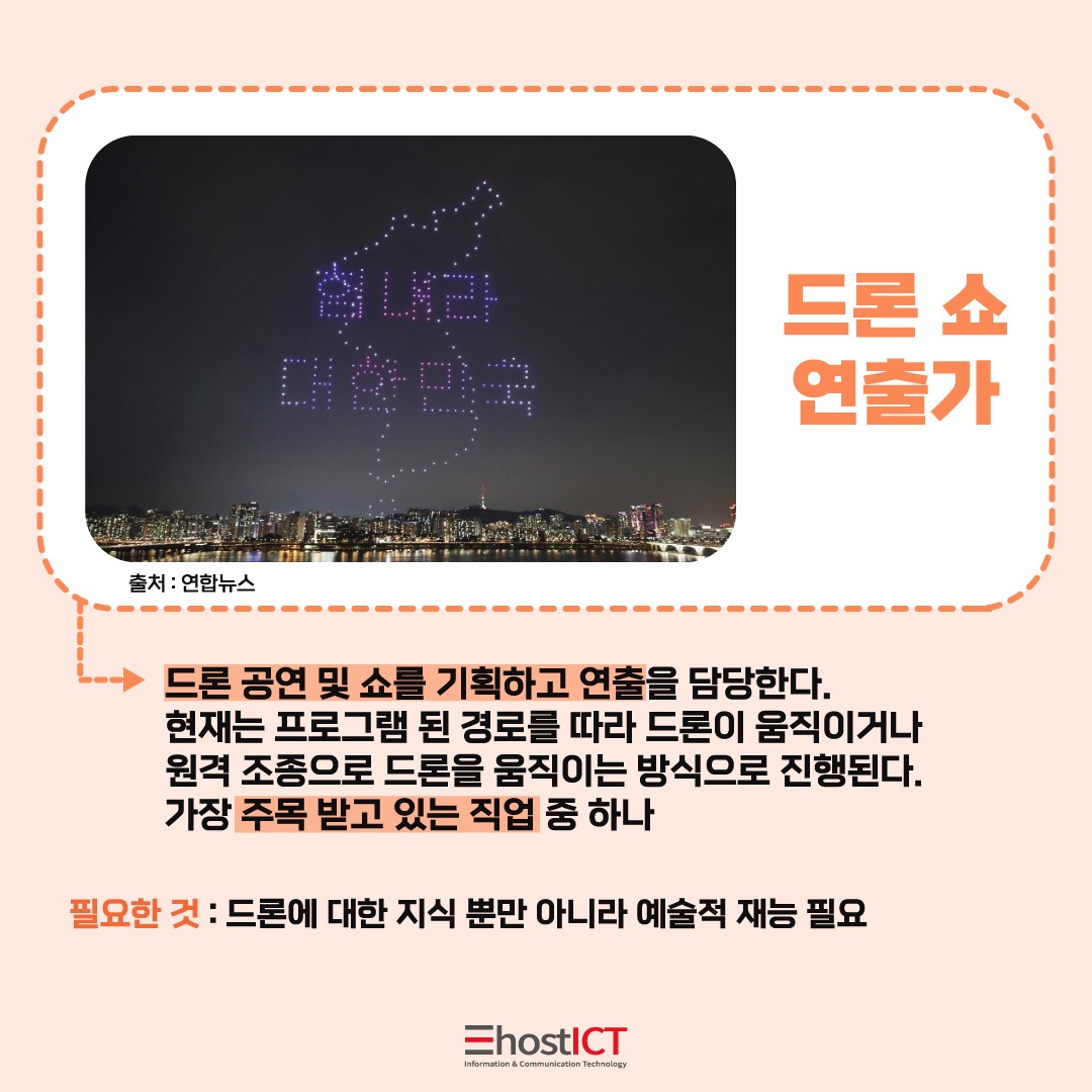 드론 쇼 연출가는 드론 공연이나 쇼를 기획 및 연출 하는 일을 합니다. 드론을 활용하여 공연을 하는 것은 아직 보편화되지 않았지만 새로운 기술을 이용한다는 점에서 수많은 관심을 얻고 있는데요.